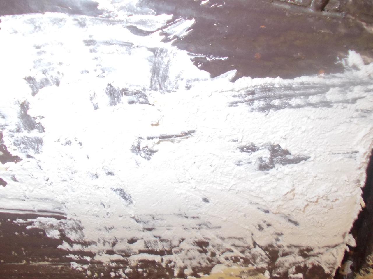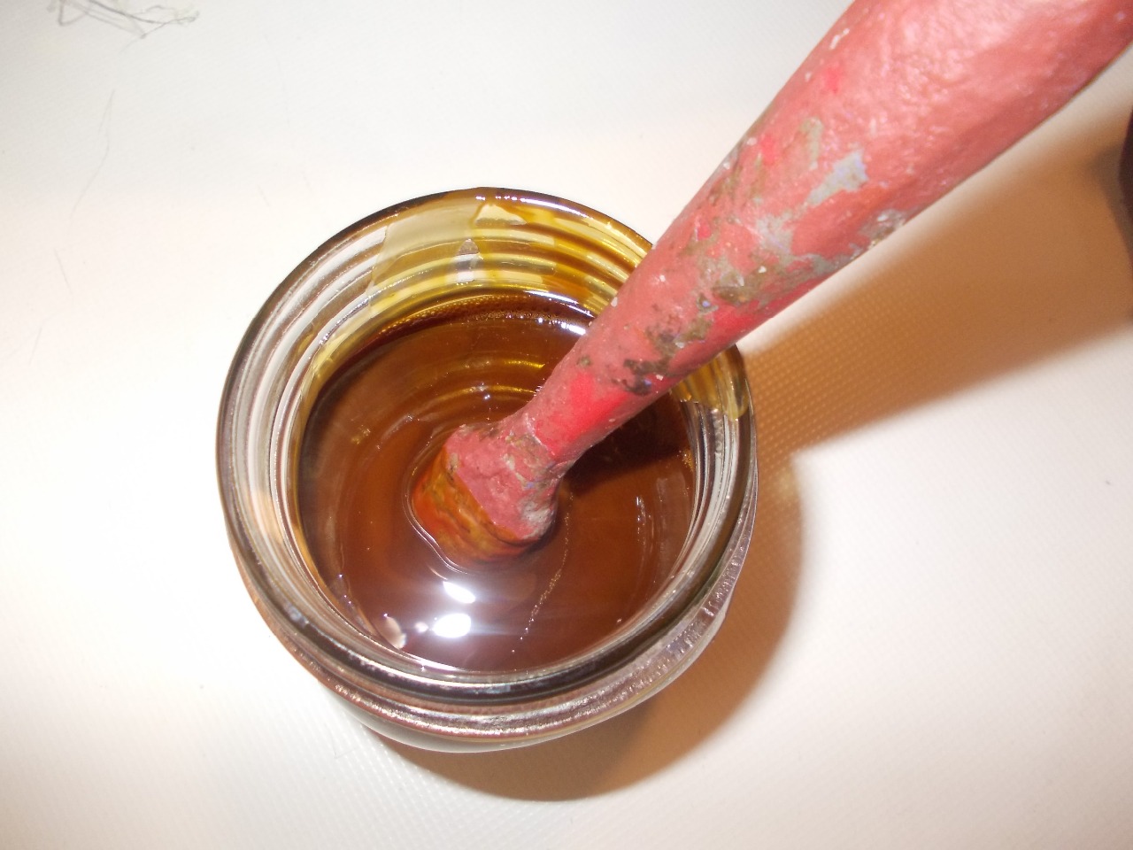 Più volte trattato con vernici a olio e smalto sintetico, dopo averlo passato con un buon antitarme l'ho stuccato e leggermente carteggiato. Per le fessure grosse ho utilizzato uno stucco per legno a base di vetroresina, per le piccole uno stucco a base di gesso e colla di pesce realizzato secondo una antica ricetta.