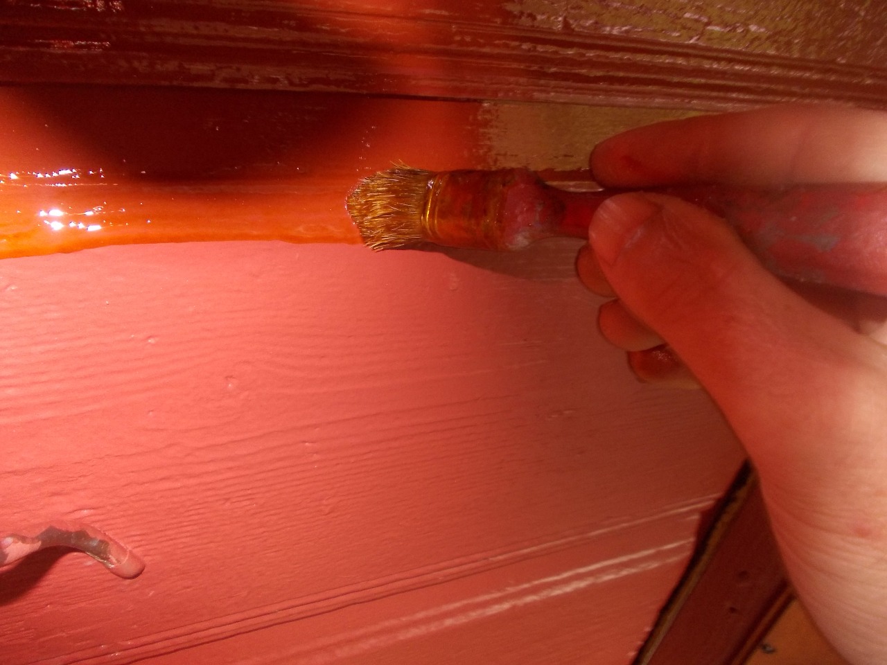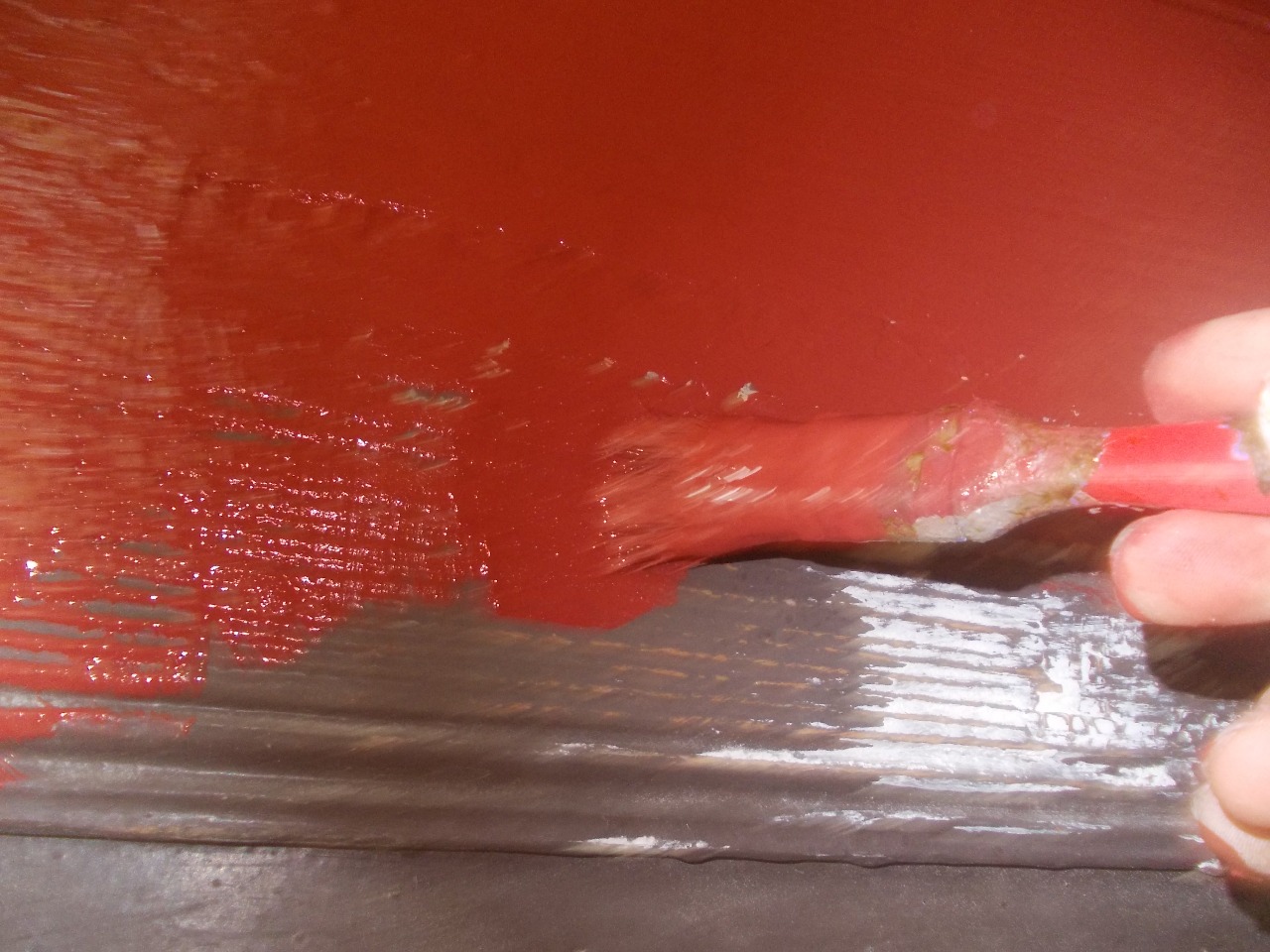 Dopo averlo leggermente carteggiato ho passato 2 mani di base rossiccia che ricorda il colore degli scuri delle malghe d'un tempo. Secondo l'antica tecnica andrebbe una cementite a base di calcina colorata con colore a tempera ma questa è una base molto delicata. Secondo una moderna tecnica si usa una cementite naturale a base di calcina (1/3) con del colore per muro sintetico concentrato traspirante ad alta copertura al corindone impermeabile per esterni. E' un colore poroso e traspirante di alta qualità.