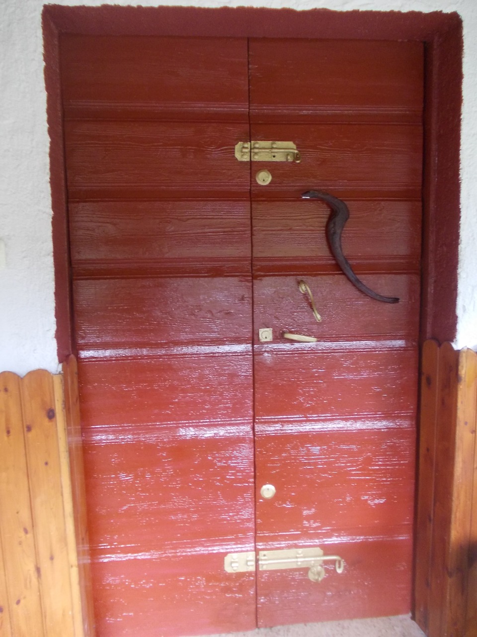 Poi quando il fondo rossiccio si è perfettamente asciugato ho passato velocemente e con estrema delicatezza un paglietta leggera da carrozieri. Infine ho dato due leggere mani di una vernice all'acqua per legno di quella impermeabile per esterni a base di cera al naturale. Non vernici sintetiche ma vernice a cera liquida opaca ben diluita con acqua fredda. Prima che si asciughi la vernice a cera risulta bianchiccia. Un tempo non si usava questa vernice a cera che fu inventata nei primi anni '90. Si usa questa copertura a vernice a cera per ben impermeabilizzare il portone.