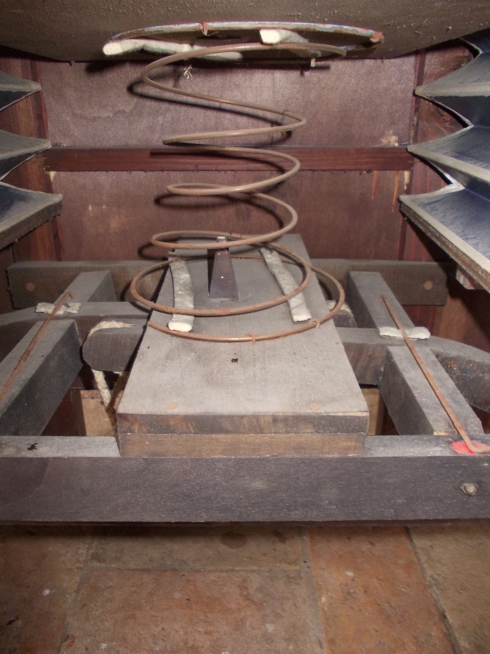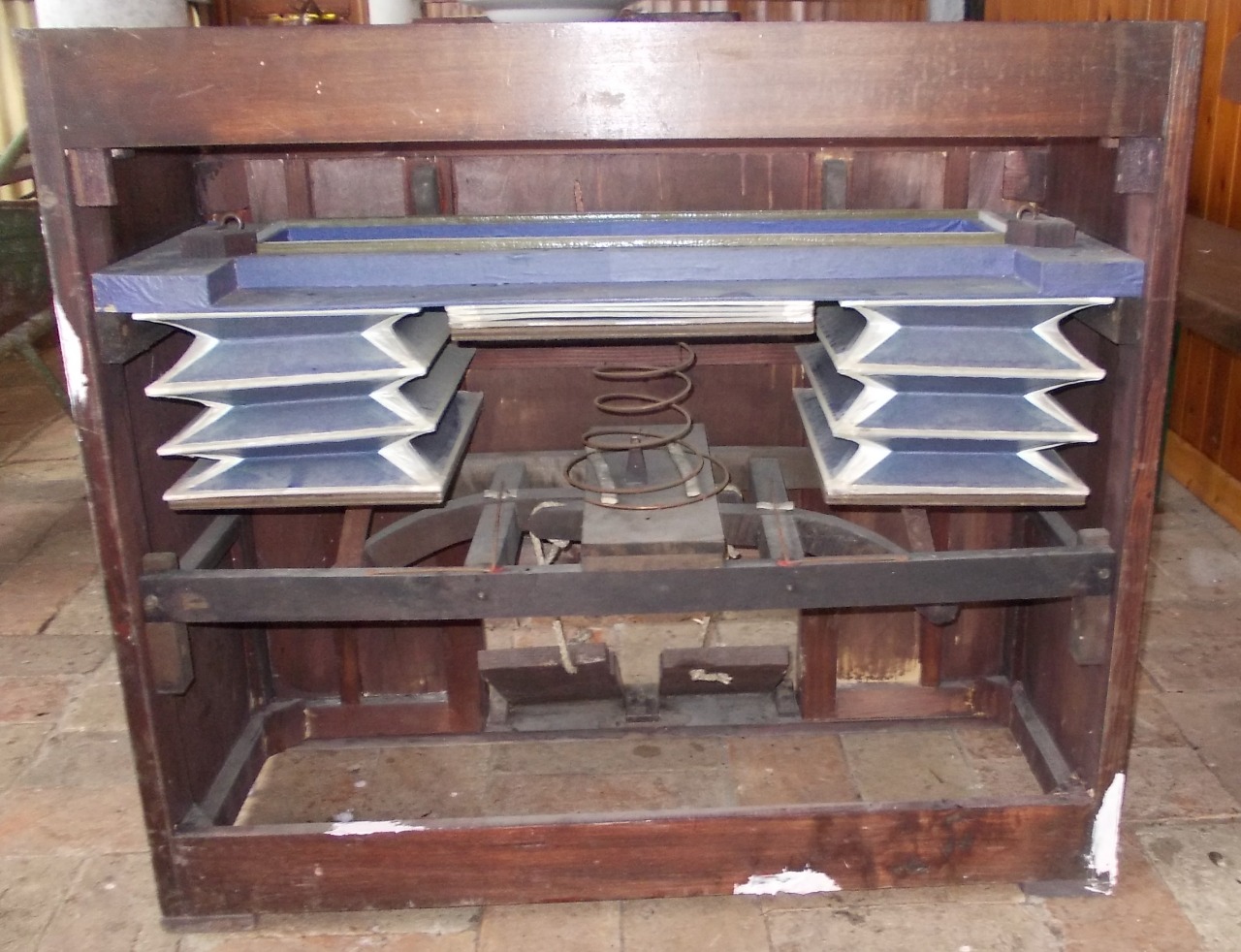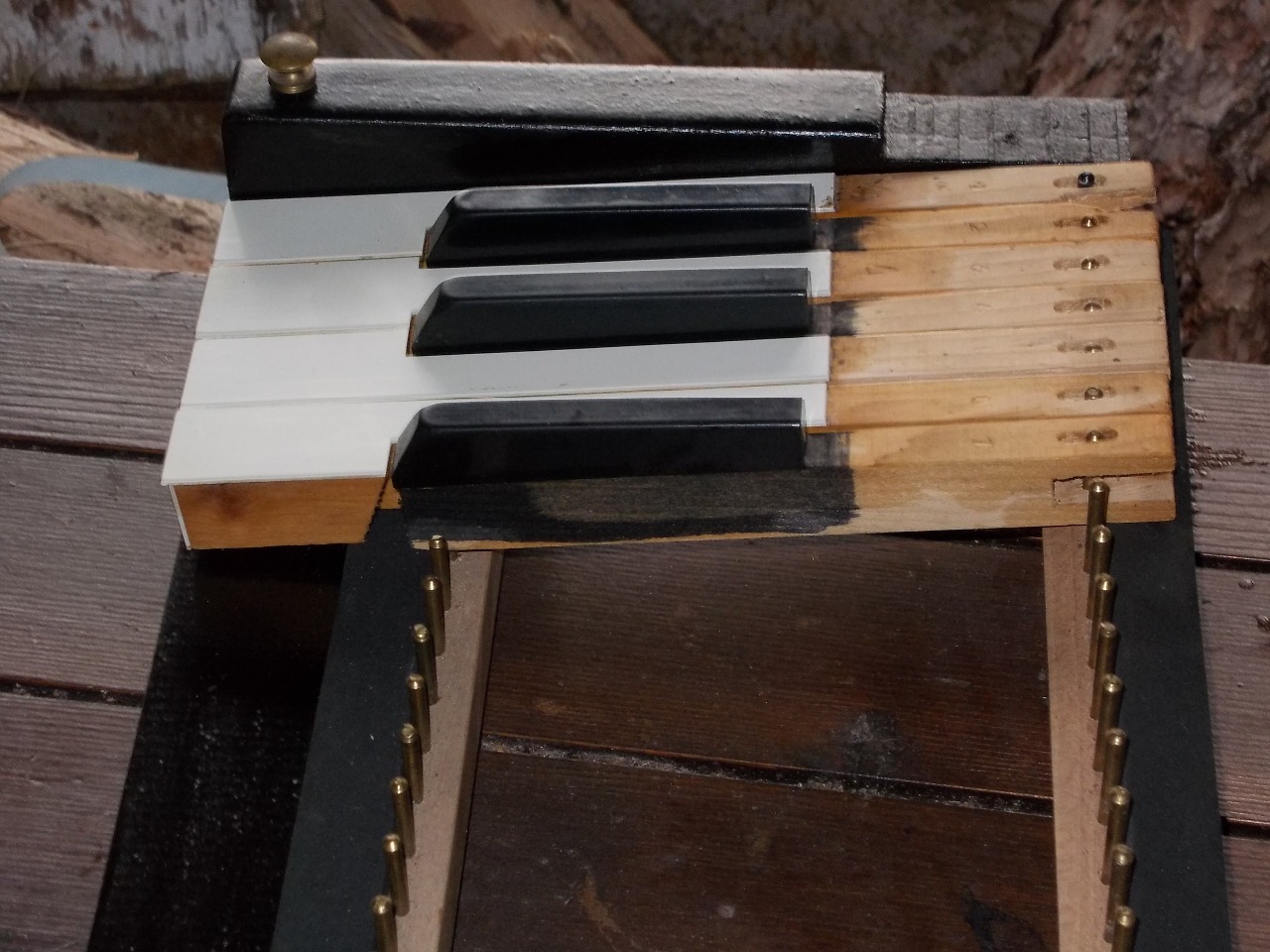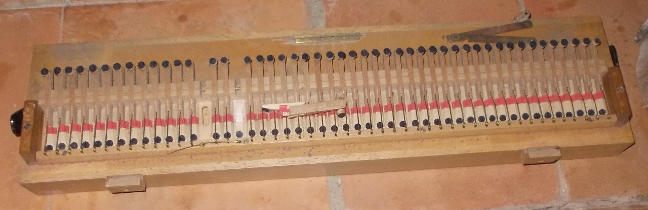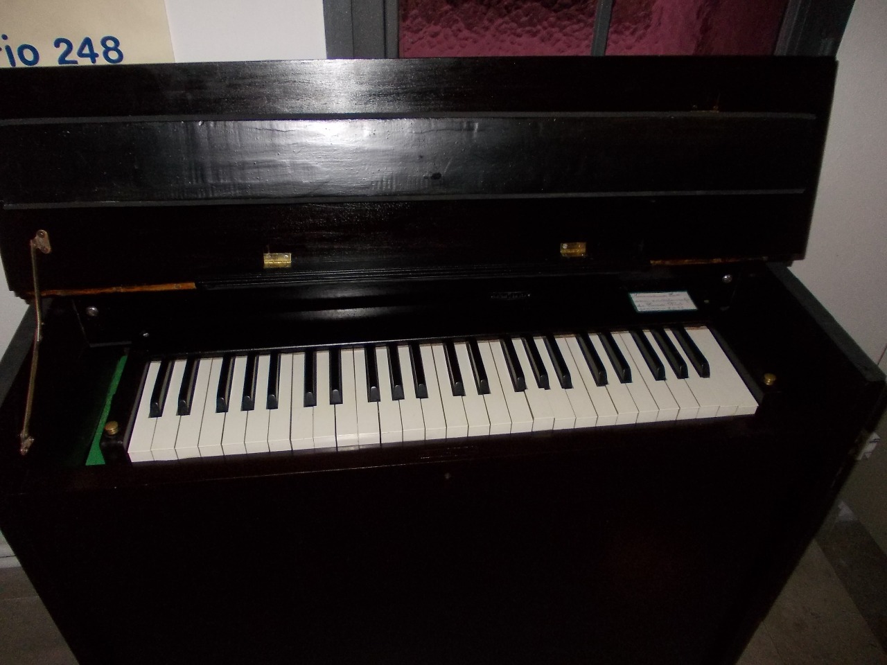 Infine ho rimontato il tutto sostituendo alcune guarnizioni. Nel cercar di calibrare e regalare la meccanica e la tastiera ho dovuto constatare alcune problematiche. Le 2 parti della meccanica sono collegate non da una strisciolina di pelle o quoio morbido come si usa in buoni harmonium ma con una sottile strisciolina di fragile tessuto di nylon che indebolito dal tempo si rompe facilmente e le molle di ottone che sembrano perfette mentre si storgnono per regolarle tendono a spezzarsi. Vista la qualità non buona dello strumento ho rimandato ad un eventuale secondo tempo la sistemazione dellmeccanica e calibratura della tastiera che farò assieme al Maestro organaro Grì di Casa ma, a mio parere, non ne vale la pena.