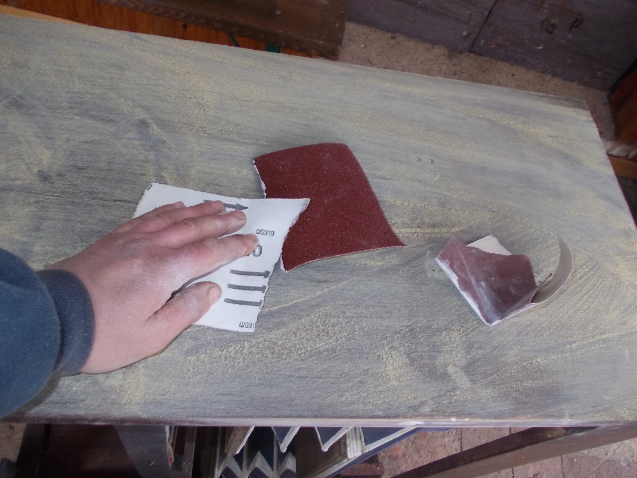 Come prima operazione ho carteggiato grossolanamente tutte le parti del mobile, stuccato con un bagno di stucco naturale a base di colla animale e gesso le parti del legno cui si è scheggiata l'immpiallicciatura di mogano e ricarteggiato il tutto con una carta vetrata sottile.