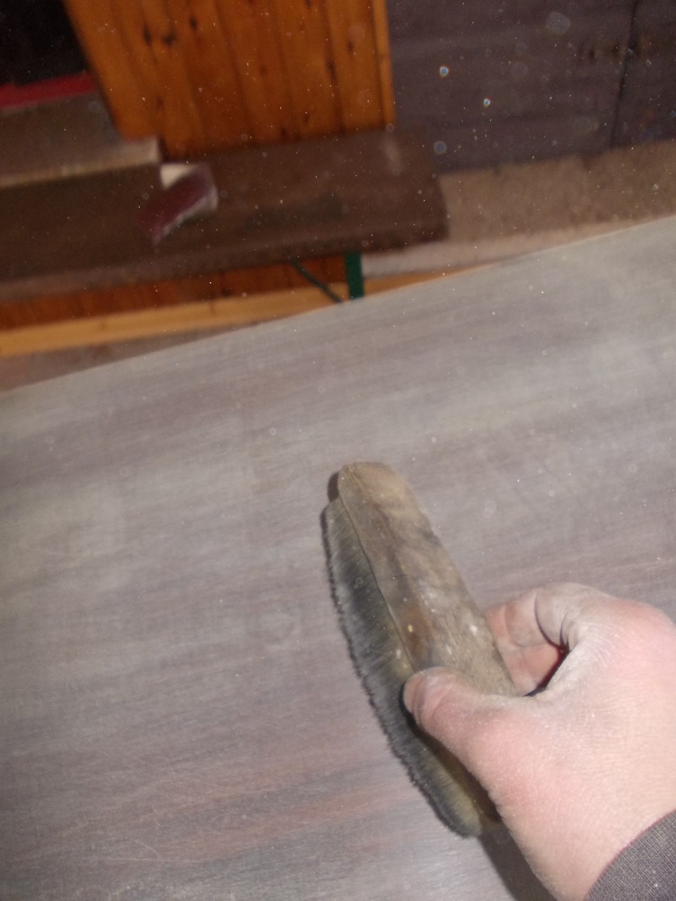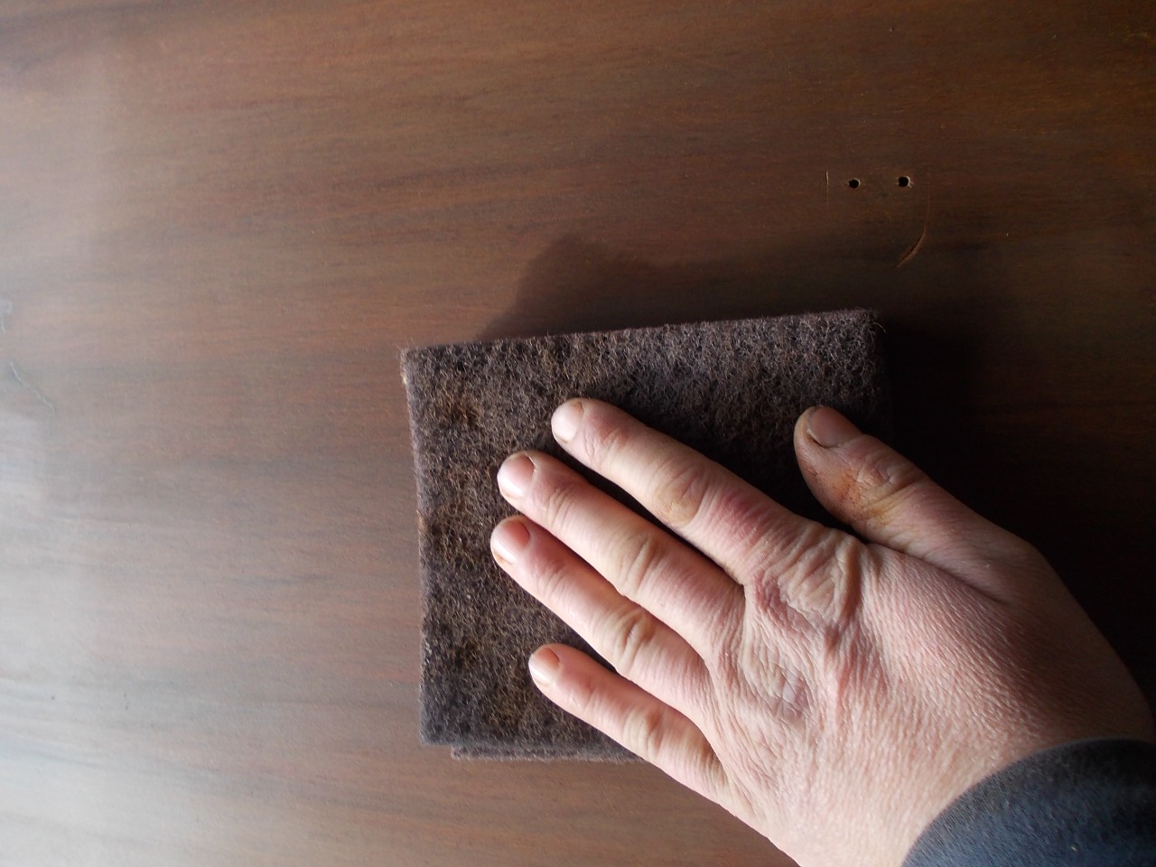 Il mobile nelle parti di mogano l'ho passato con un colorante all'alcool a base di anilina misto tra tinta mogano, noce e Teak allungato con un pizzico di gommalacca. Dopo una prima stesura del colorante sono risultate alcune imperfezioni dovute all'orripilante vernice plastica originale che non ho potuto togliere del tutto per non rovinare il sottilissimo strato di impiallicciatura. Ho quindi passato una paglietta sottile da carroziere e data una seconda mano di colorante.