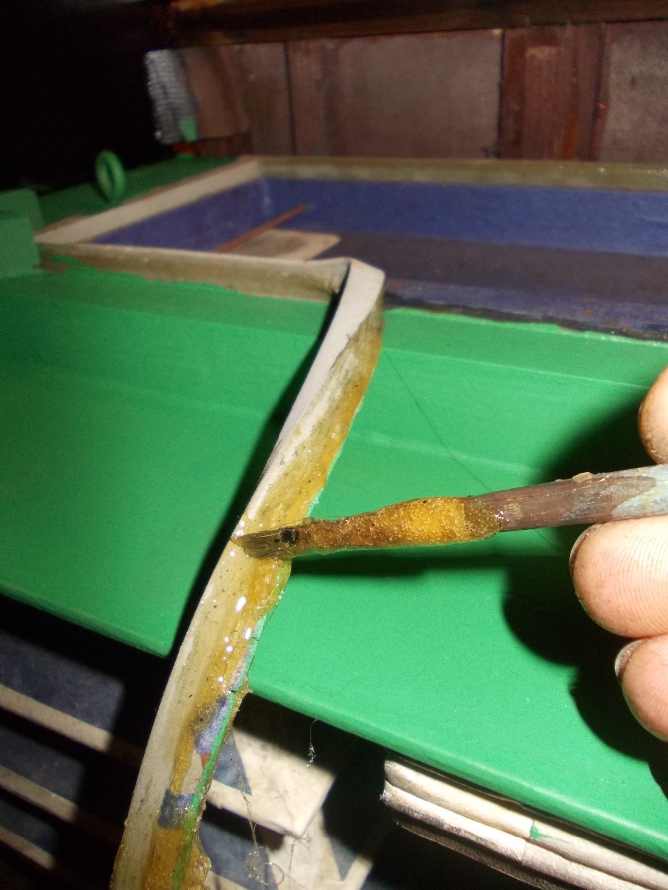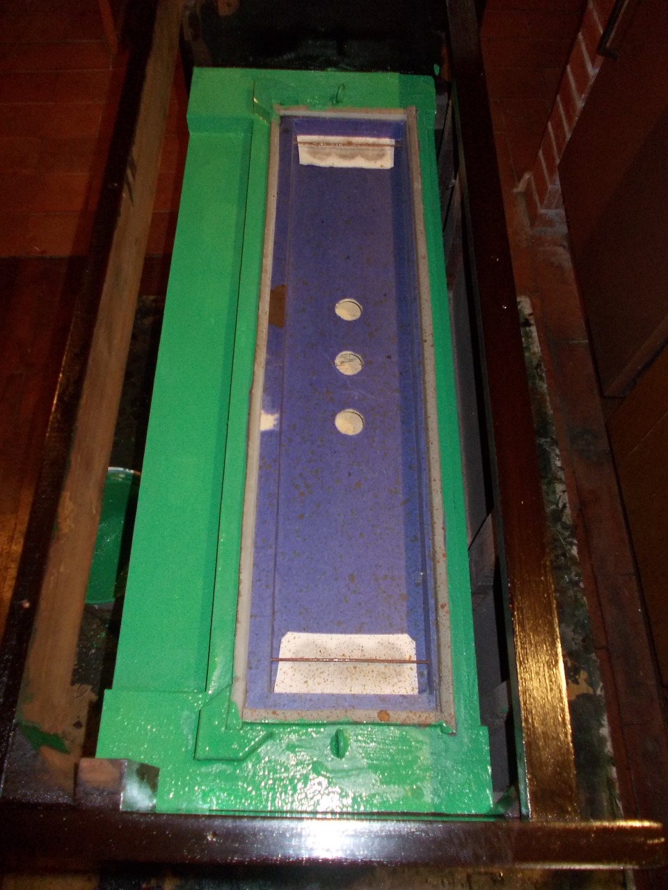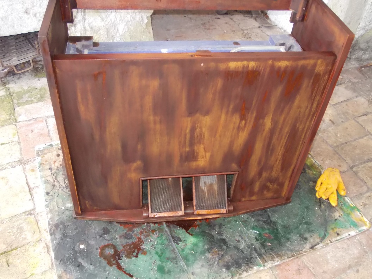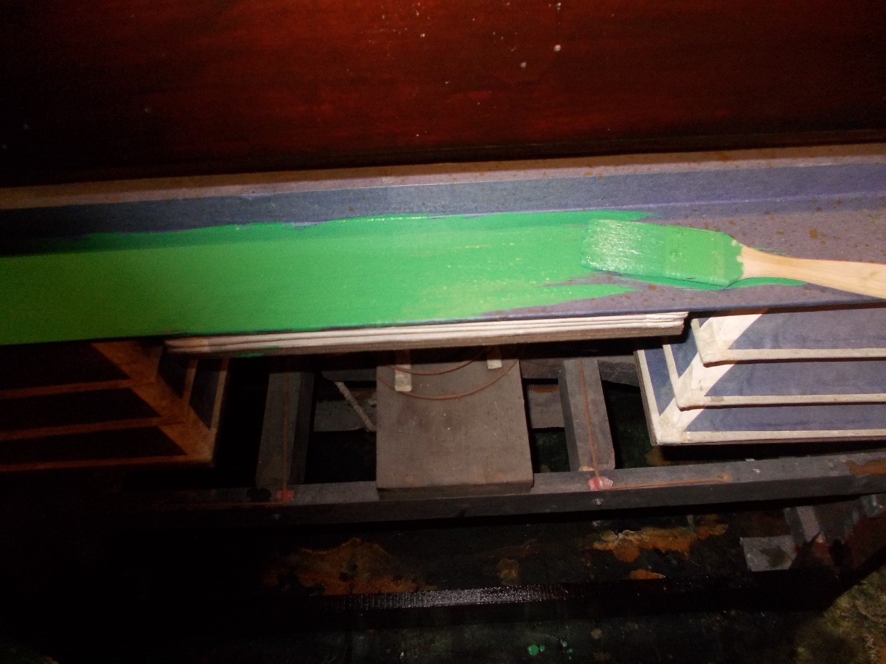 La base del somiere che è tutta rivestita di sottilissima carta velina, visto che qesta risultava macchiata e leggermente rovinata, l'ho colorata con un colore lavabile da muro come si usa fare nelle parti lignee interne dei modermi organi.