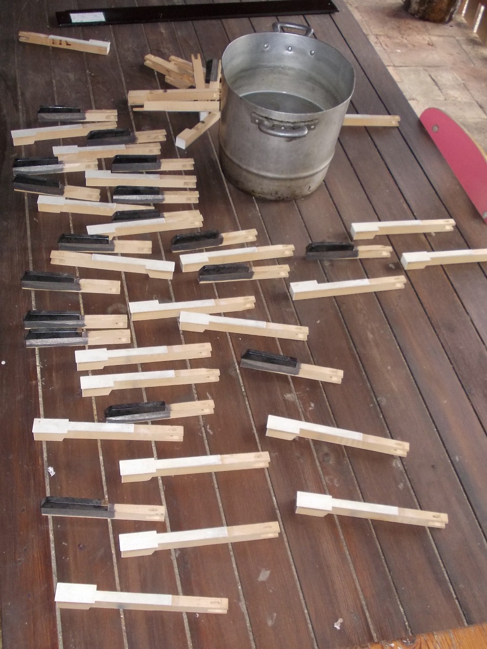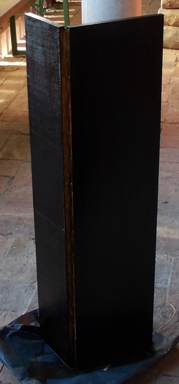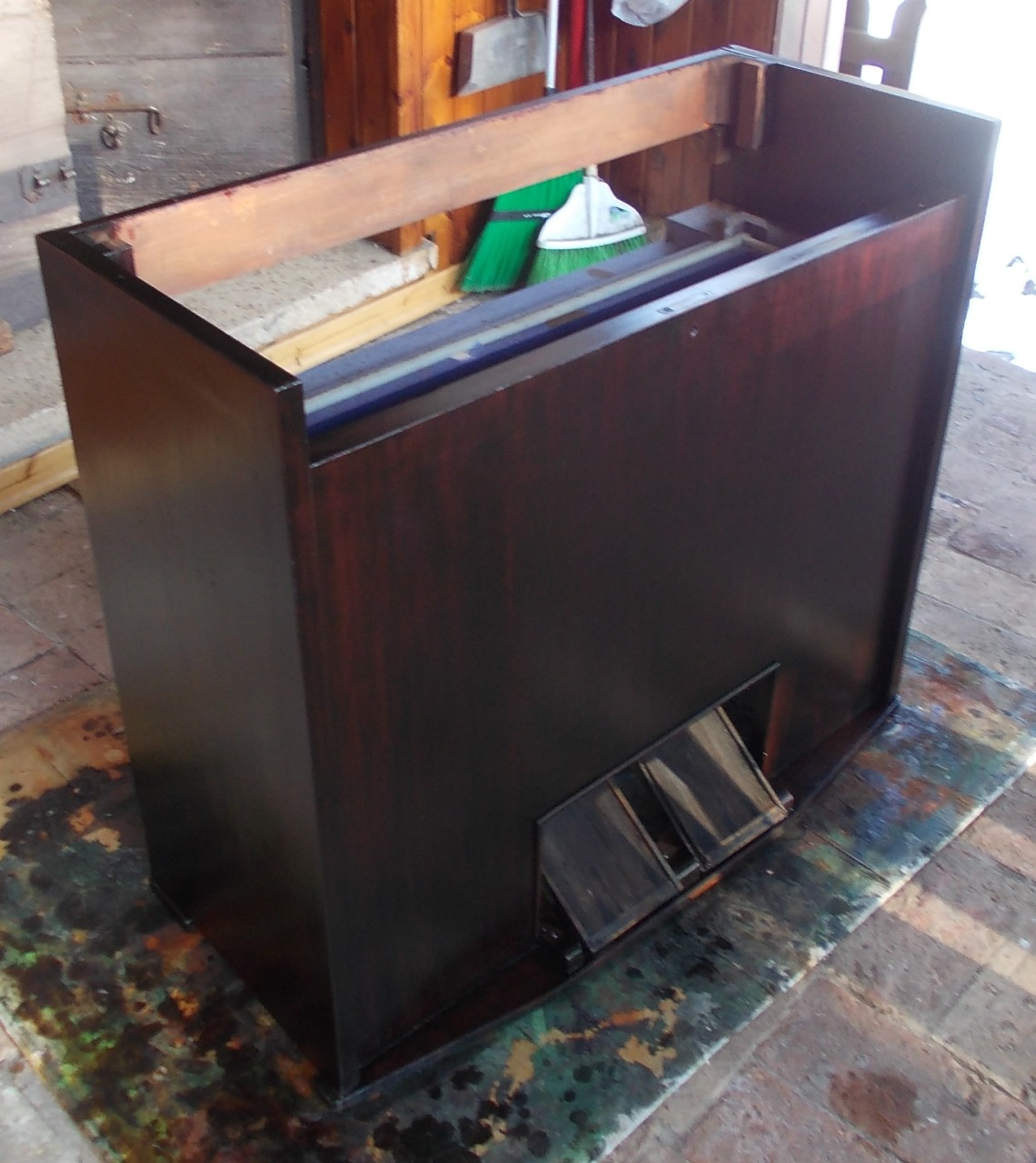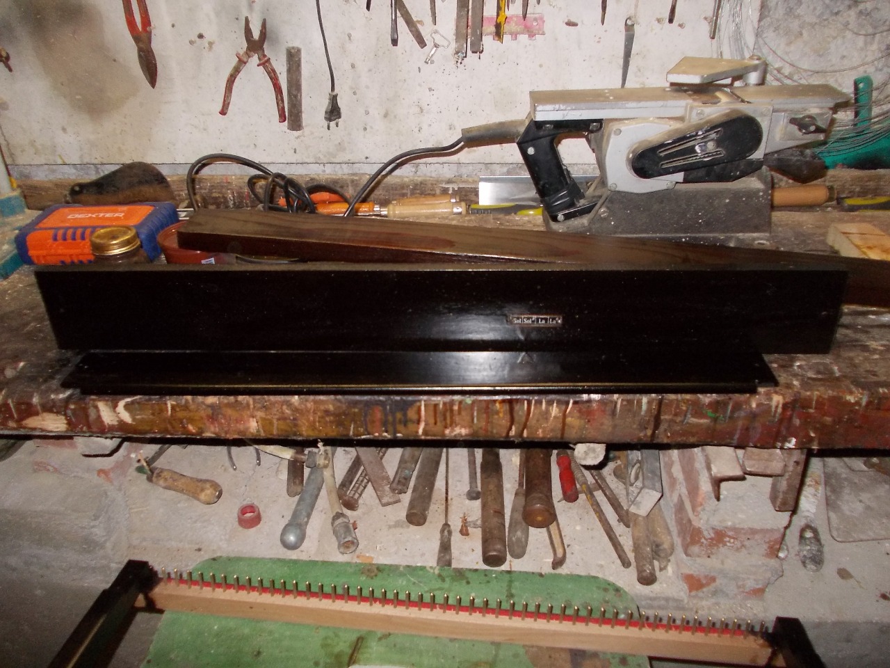 A questo punto ho lucidato tutto il mobile con gommalacca ad alta densità di quelle già pronte data con un pennello. Vista la scarsa qualità dello strumento non ho usato pregiate lacche o vernici a base di alcool. Solo lungo il bordo della tastiera ho dato una lacca nera a base di gommalacca di buona qualità. Le altre parti nere dello strumento le ho colorate con uno smalto sintetico leggermente satinato. Comunque le varie tinture date sono migliori di quelle che lo strumento aveva in origine.