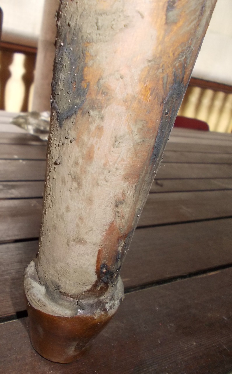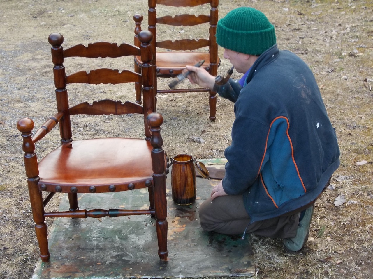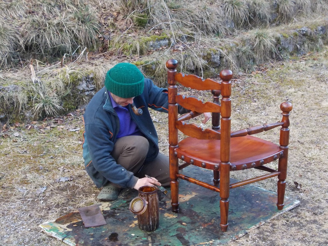 Per prima cosa, visto che risultavano fortemente tarlate e con una gamba indebolita, ho provveduto a trattare il tutto con dell'aceto che è un ottimo antitarlo naturale e con dell'atitarlo chimico. Ho poi chiuso per quindici giorni le sedie in un nylon, tolto il quale sono rimaste all'aria per una settimana. Infine con uno stucco tintato noce scurissimo ho passato tutte le parti lesionate dal tarlo cioè quelle piene di fori.